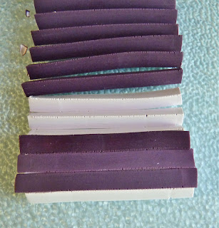 You will need to select your colors. I used shades of purple for this cane. You will need 3 shades of whatever color you choose, (or you can use 3 different colors) one dark, one medium and one light. I mixed colors to match a paint sample, you can see a portion of it above the cane. I use a combination of clays to get the right consistence. The new Premo and new Kato are both very soft for caning so I add other firmer clays, like older formula Kato translucent and/or white Pardo Art Clay (the kind in the blister packs, not the jars). You can also leach the clay until it becomes firmer but I don't have the patience to leach. You want the clay to be firm enough to not squish when you work with it but not so firm that it's difficult to put though the extruder.... like Goldilocks you want it to be "just right".